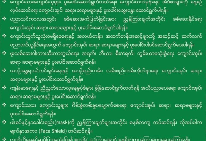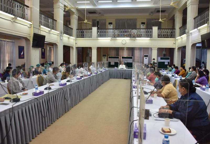 ကျန်းမာရေးနှင့် အားကစားဝန်ကြီးဌာန ပြည်ထောင်စုဝန်ကြီး ဒေါက်တာသက်ခိုင်ဝင်းသည် ယနေ့နံနက်ပိုင်း ၉ နာရီတွင် ရန်ကုန်တိုင်းဒေသကြီး လမ်းမတော်မြို့နယ်ရှိ ဆေး တက္ကသိုလ် (၁) အစည်းအဝေးခန်းမ၌ ရန်ကုန်မြို့ရှိ ဆေးနှင့်ဆေးနှီးနွယ် တက္ကသိုလ်များမှ ပါမောက္ခချုပ် များ၊ ပါမောက္ခဌာနမှူးများ၊ သက်ဆိုင်ရာတာဝန်ရှိသူများနှင့် တွေ့ဆုံကာ ဆေးတက္ကသိုလ် ဘွဲ့လွန်/ဘွဲ့ကြိုသင်တန်းများ ဖွင့်လှစ်နိုင်ရေး ကိစ္စရပ်များနှင့်ပတ်သက်၍ မှာကြား သည်။