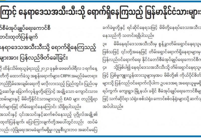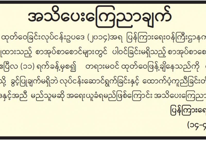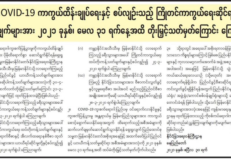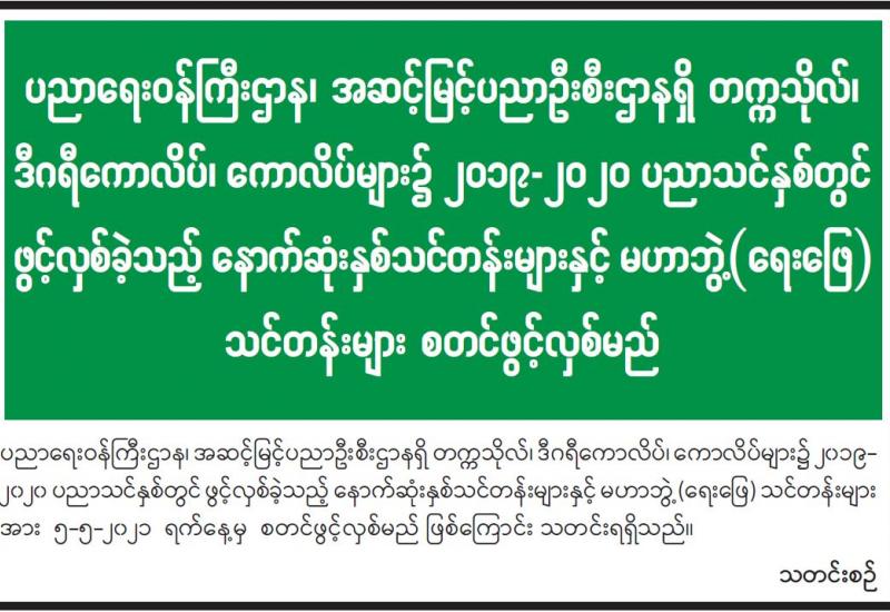 ပညာရေးဝန်ကြီးဌာန၏ ၂၀၂၁-၂၀၂၂ ပညာသင်နှစ် အခြေခံပညာ အထက်တန်း၊ အလယ်တန်း၊ မူလတန်းကျောင်းများကို ၂၀၂၁ ခုနှစ်၊ ဇွန် ၁ ရက်မှစတင်၍ ပုံမှန်စာသင်နှစ်အတိုင်း ဖွင့်လှစ် မည်ဖြစ်ကြောင်း၊ ကျောင်းအပ်နှံရေး သီတင်းပတ်အဖြစ် ၂၀၂၁ ခုနှစ်၊ မေ ၂၄ ရက် (တနင်္လာနေ့) မှ ၃၁ ရက် (တနင်္လာနေ့)အထိ သတ်မှတ်ထားသဖြင့် ယင်းကာလအတွင်း အတန်းအားလုံး ကျောင်းအပ်နှံကြရန်နှင့် ကျောင်းအပ်နှံရာတွင် မည်သည့်အခကြေးငွေ လုံးဝ (လုံးဝ) ကောက်ခံမှု မရှိကြောင်း၊ ကျောင်းအပ်နှံ သည့်ကျောင်းသားအားလုံးကို ကျောင်းသုံး ပြဋ္ဌာန်းစာအုပ်များ၊ ဗလာစာအုပ်များ၊ ဘောပင်၊ ခဲတံများနှင့် COVID-19 ကြိုတင်ကာကွယ်ရေးအတွက် Mask နှင့် Face Shield များကို အခမဲ့ထောက်ပံ့ ပေးသွားမည်ဖြစ်ကြောင်း ပညာရေးဝန်ကြီးဌာနမှသတင်း ရရှိသည်။