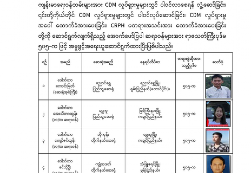 ၁။ နိုင်ငံတော်၏အုပ်ချုပ်မှုယန္တရား ပျက်ပြားစေရန် ရည်ရွယ်ချက်ဖြင့် နိုင်ငံ့ဝန်ထမ်းများအား CDM လှုပ်ရှားမှုတွင် ပါဝင်စေရန် လှုံ့ဆော်ခြင်း၊ CRPH မတရားအသင်းအား ထောက်ခံသည့် အကြောင်းအရာများ၊ မမှန်သတင်းများအား ဖြန့်ဝေခြင်း၊ နိုင်ငံတော် တည်ငြိမ်အေးချမ်းမှုကို ပျက်ပြားစေပြီး ဆူပူအုံးကြွမှု ဖြစ်ပေါ်စေရန်နှင့် အများပြည်သူ အထိတ်တလန့်ဖြစ်စေရန်အတွက် သွေးထိုး လှုံ့ဆော်မှုများပြုလုပ်ခြင်း၊ Social Punishment ပြုလုပ်ခြင်းများကို လှုမှုကွန်ရက်စာမျက်နှာများတွင် ရည်ရွယ်ချက်ရှိရှိ ဖော်ပြခြင်းနှင့် ဖြန့်ဝေခြင်းများ ဆောင်ရွက်လျက်ရှိသည့် အောက်ပါကျောင်းသားသမဂ္ဂအဖွဲ့ဝင်များနှင့် အခြား ပါဝင်ပတ်သက်သူများအား ရာဇသတ်ကြီး ပုဒ်မ ၅၀၅ - က ဖြင့် အမှုဖွင့် အရေးယူ ဆောင်ရွက်လျက်ရှိကြောင်း ထုတ်ပြန်အပ်ပါသည်။