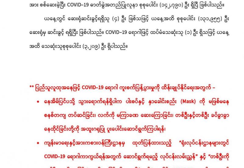 (၂၆-၄-၂၀၂၁) ရက်နေ့၊ ည (၈:၀၀) နာရီမှ (၂၇-၄-၂၀၂၁) ရက်နေ့၊ ည (၈:၀၀) နာရီအတွင်း ဓာတ်ခွဲနမူနာစုစုပေါင်း (၂,၄၄၆) ခုအား စစ်ဆေးပြီးစီးခဲ့ရာ COVID-19 ရောဂါ ဓာတ်ခွဲအတည်ပြု လူနာသစ် (၃၈) ဦး တွေ့ရှိရပါသည်။ သို့ဖြစ်ပါ၍ ယနေ့အထိ ဓာတ်ခွဲနမူနာ စုစုပေါင်း (၂,၅၇၁,၂၅၇) ခု အား စစ်ဆေးခဲ့ပြီး COVID-19 ဓာတ်ခွဲအတည်ပြုလူနာ စုစုပေါင်း (၁၄၂,၇၇၈) ဦး ရှိပြီ ဖြစ်ပါသည်။
