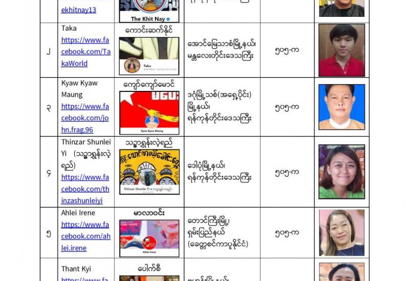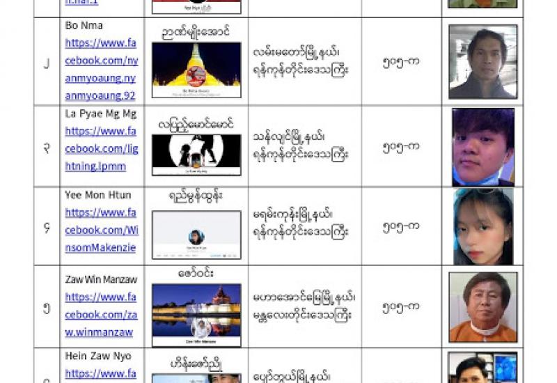 နိုင်ငံတော်၏ အုပ်ချုပ်မှုယန္တရားပျက်ပြားစေရန်ရည်ရွက်ချက်ဖြင့် နိုင်ငံ့ဝန်ထမ်းများအား CDM လှုပ်ရှားမှု တွင် ပါဝင်စေရန်လှုံ့ဆော်ခြင်း၊ CRPH မတရားအသင်းအား ထောက်ခံသည့် အကြောင်းအရာများ၊ မမှန်သတင်းများအားဖြန့်ဝေခြင်း၊ နိုင်ငံတော်တည်ငြိမ်အေးချမ်းမှုကို ပျက်ပြားစေပြီး ဆူပူအုံကြွမှု ဖြစ်ပေါ်စေရန်နှင့် အများပြည်သူအထိတ်တလန့်ဖြစ်စေရန် အတွက် သွေးထိုးလှုံ့ဆော် မှုများပြုလုပ်ခြင်း၊ Social Pumishment ပြုလုပ်ခြင်းများကို လူမှုကွန်ရက် စာမျက်နှာများတွင် ရည်ရွယ်ချက်ရှိရှိ ဖြင့်ဖော်ပြခြင်းနှင့် ဖြန့်ဝေခြင်းများ ဆောင်ရွက် လျက်ရှိသည့် အောက်ဖော်ပြပါ အနုပညာရှင်အချို့နှင့် အခြားပါဝင်ပတ်သက်သူများအား ရာဇသတ်ကြီးပုဒ်မ ၅၀၅-က ဖြင့် အမှုဖွင့်အရေးယူ ဆောင်ရွက် လျက်ရှိပါသည်။