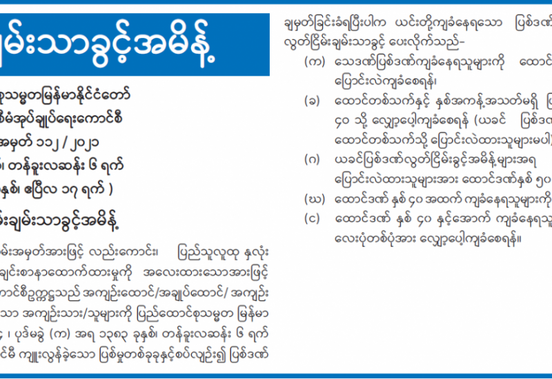 ပြည်ထောင်စုသမ္မတမြန်မာနိုင်ငံတော်သည် မြန်မာနှစ်သစ်မင်္ဂလာအခါသမယအထိမ်းအမှတ်အား ဖြင့် လည်းကောင်း ၊ အေးချမ်းသာယာပြီး ခေတ်မီဖွံ့ဖြိုးတိုးတက်သော စည်းကမ်းပြည့်ဝသည့် ဒီမိုက ရေစီ နိုင်ငံ တော်သစ်တည်ဆောက်နေချိန်တွင် ပြစ်ဒဏ်ကျ အကျဉ်းသား၊ အကျဉ်းသူများမှလည်း တစ်ဖက် တစ်လမ်းမှ အကျိုးပြုစေမည့် နိုင်ငံသားများအဖြစ်သို့ ပြောင်းလဲပေးရန်အတွက်လည်းကောင်း၊ ပြည်သူ လူထု နှလုံးစိတ်ဝမ်းအေးချမ်းစေရေးနှင့် လူသားချင်းစာနာထောက်ထားမှုကို အလေးထားသော အားဖြင့် လည်းကောင်း၊ နိုင်ငံအချင်းချင်း မိတ်ဝတ်မပျက်ဆက်ဆံရေးကို ရှေးရှုသောအားဖြင့် လည်း ကောင်း၊ နိုင်ငံတော် စီမံအုပ်ချုပ်ရေးကောင်စီဉက္ကဌ က အမိန့်အမှတ် ၁၁၃/၂၀၂၁ နှင့် ၁၁၄/၂၀၂၁ တို့ဖြင့် အကျဉ်းထောင်၊ အချုပ်ထောင်၊ စခန်းအသီးသီးတို့တွင် အကျဉ်းကျခံနေကြရသော အကျဉ်းသား၊ အကျဉ်းသူ နိုင်ငံသား ၂၃၀၄၇ ဦးနှင့် နိုင်ငံခြားသား အကျဉ်းသား၊အကျဉ်းသူ ၁၃၇ ဦး၊ စုစုပေါင်း ၂၃၁၈၄ ဦးတို့ကို ယနေ့တွင် ပြစ်ဒဏ်လွတ်ငြိမ်းသက်သာခွင့် ပြုခဲ့ကြောင်းသိရသည်။