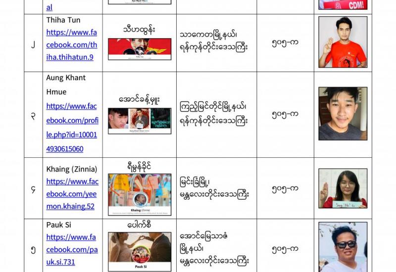 နိုင်ငံတော်၏ အုပ်ချုပ်မှုယန္တရားပျက်ပြားစေရန်ရည်ရွက်ချက်ဖြင့် နိုင်ငံ့ဝန်ထမ်းများအား CDM လှုပ်ရှားမှုတွင် ပါဝင်စေရန်လှုံ့ဆော်ခြင်း၊ CRPH မတရားအသင်းအား ထောက်ခံသည့် အကြောင်းအရာများ၊ မမှန်သတင်းများအားဖြန့်ဝေခြင်း၊ နိုင်ငံတော်တည်ငြိမ်အေးချမ်းမှုကို ပျက်ပြားစေပြီး ဆူပူအုံကြွမှုဖြစ်ပေါ်စေရန်နှင့် အများပြည်သူအထိတ်တလန့်ဖြစ်စေရန် အတွက် သွေးထိုးလှုံ့ဆော်မှုများပြုလုပ်ခြင်း၊ Social Pumishment ပြုလုပ်ခြင်းများကို လူမှုကွန်ရက် စာမျက်နှာများတွင် ရည်ရွယ်ချက်ရှိရှိ ဖြင့်ဖော်ပြခြင်းနှင့် ဖြန့်ဝေခြင်းများ ဆောင်ရွက် လျက်ရှိသည့် အောက်ဖော်ပြပါ အနုပညာရှင်အချို့နှင့် အခြားပါဝင်ပတ်သက်သူများအား ရာဇသတ်ကြီးပုဒ်မ ၅၀၅-က ဖြင့် အမှုဖွင့်အရေးယူ ဆောင်ရွက်လျက်ရှိသည်။