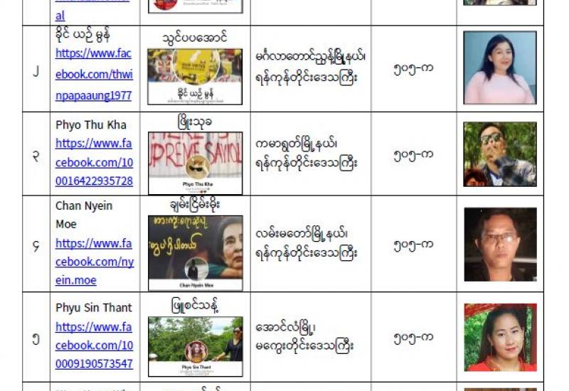 နိုင်ငံတော်၏ အုပ်ချုပ်မှုယန္တရားပျက်ပြားစေရန်ရည်ရွက်ချက်ဖြင့် နိုင်ငံ့ဝန်ထမ်းများအား CDM လှုပ်ရှား မှုတွင် ပါဝင်စေရန်လှုံ့ဆော်ခြင်း၊ CRPH မတရားအသင်းအား ထောက်ခံသည့် အကြောင်းအရာများ၊ မမှန်သတင်းများအားဖြန့်ဝေခြင်း၊ နိုင်ငံတော်တည်ငြိမ်အေးချမ်းမှုကို ပျက်ပြားစေပြီး ဆူပူအုံကြွမှု ဖြစ်ပေါ်စေရန်နှင့် အများပြည်သူအထိတ်တလန့်ဖြစ်စေရန် အတွက် သွေးထိုးလှုံ့ဆော်မှုများ ပြုလုပ်ခြင်း၊ Social Pumishment ပြုလုပ်ခြင်းများကို လူမှုကွန်ရက် စာမျက်နှာများတွင် ရည်ရွယ်ချက်ရှိရှိ ဖြင့်ဖော်ပြခြင်းနှင့် ဖြန့်ဝေခြင်းများ ဆောင်ရွက် လျက်ရှိသည့် အောက်ဖော်ပြပါ အနုပညာရှင်အချို့နှင့် အခြားပါဝင်ပတ်သက်သူများအား ရာဇသတ်ကြီးပုဒ်မ ၅၀၅-က ဖြင့် အမှုဖွင့်အရေးယူ ဆောင်ရွက် လျက်ရှိပါသည်။