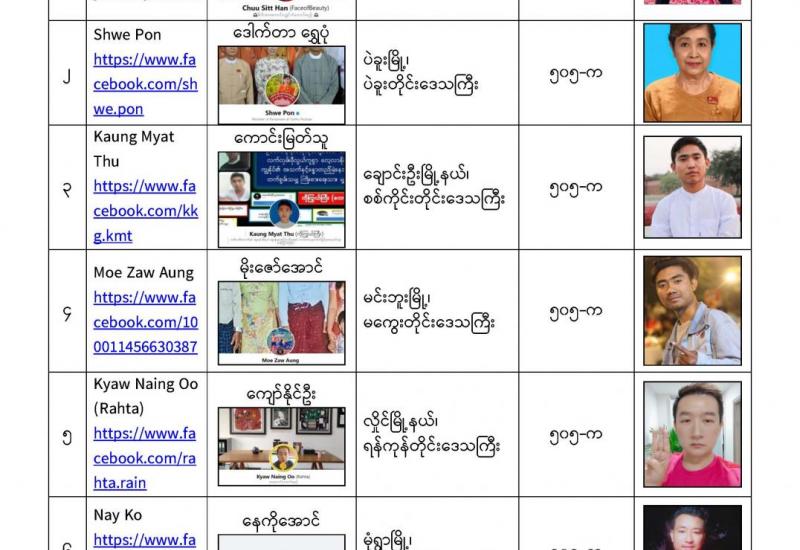 နိုင်ငံတော်၏ အုပ်ချုပ်မှုယန္တရားပျက်ပြားစေရန်ရည်ရွက်ချက်ဖြင့် နိုင်ငံ့ဝန်ထမ်းများအား CDM လှုပ်ရှားမှုတွင် ပါဝင်စေရန်လှုံ့ဆော်ခြင်း၊ CRPH မတရားအသင်းအား ထောက်ခံသည့် အကြောင်းအရာများ၊ မမှန်သတင်းများအားဖြန့်ဝေခြင်း၊ နိုင်ငံတော်တည်ငြိမ်အေးချမ်းမှုကို ပျက်ပြားစေပြီး ဆူပူအုံကြွမှုဖြစ်ပေါ်စေရန်နှင့် အများပြည်သူအထိတ်တလန့်ဖြစ်စေရန် အတွက် သွေးထိုးလှုံ့ဆော်မှုများပြုလုပ်ခြင်း၊ Social Pumishment ပြုလုပ်ခြင်းများကို လူမှုကွန်ရက် စာမျက်နှာများတွင် ရည်ရွယ်ချက်ရှိရှိ ဖြင့်ဖော်ပြခြင်းနှင့် ဖြန့်ဝေခြင်းများ ဆောင်ရွက် လျက်ရှိသည့် အောက်ဖော်ပြပါ အနုပညာရှင်အချို့နှင့် အခြားပါဝင်ပတ်သက်သူများအား ရာဇသတ်ကြီးပုဒ်မ ၅၀၅-က ဖြင့် အမှုဖွင့်အရေးယူ ဆောင်ရွက်လျက်ရှိပါသည်။