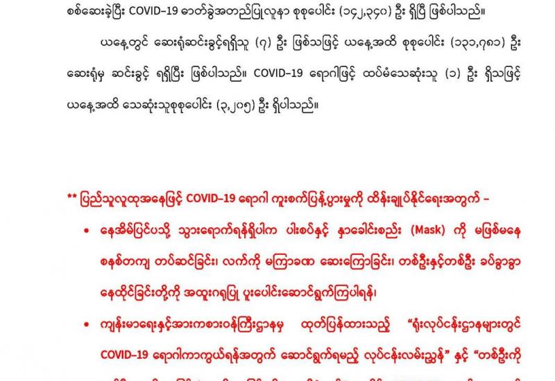 ပို့ဆောင်ရေးနှင့် ဆက်သွယ်ရေးဝန်ကြီးဌာန ပြည်ထောင်စုဝန်ကြီးနှင့် မြန်မာ့မီးရထားမှ ဦးဆောင် ညွှန်ကြားရေးမှူး၊ အထွေထွေ မန်နေဂျာများ၊ ဒုတိယအထွေထွေ မန်နေဂျာများ၊ တိုင်း တာဝန်ခံများတွေ့ဆုံဆွေးနွေးခြင်းကို ယမန်နေ့ နံနက် ၈ နာရီခွဲက နေပြည်တော်ရှိ ပို့ဆောင် ရေးနှင့် ဆက်သွယ်ရေး ဝန်ကြီးဌာန အစည်းအဝေးခန်းမ၌ ကိုဗစ်-၁၉ ကာကွယ်ထိန်းချုပ်ရေး စည်းမျဉ်း စည်းကမ်းများနှင့်အညီ ကျင်းပသည်။