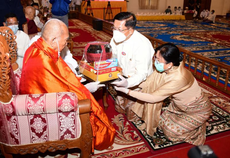 ၂၀၂၁ ခုနှစ်၊ သာသနာတော်ဆိုင်ရာ ဘွဲ့တံဆိပ်တော်ဆက်ကပ်ခံယူမည့် ဆရာတော် များအား ပြည်ထောင်စုသမ္မတမြန်မာနိုင်ငံတော်၊ နိုင်ငံတော်စီမံအုပ်ချုပ်ရေးကောင်စီ ဥက္ကဋ္ဌ တပ်မတော်ကာကွယ်ရေးဦးစီးချုပ် ဗိုလ်ချုပ်မှူးကြီး မင်းအောင်လှိုင်နှင့်ဇနီး ဒေါ်ကြူကြူလှ တို့က ယနေ့နံနက်ပိုင်းတွင် နေပြည်တော်၊ ဥပ္ပါတသန္တိစေတီတော်မြတ်ကြီး ပရိဝုဏ်အတွင်း ရှိ သာသနာ့မဟာဗိမာန်တော်ကြီး၌ နေ့ဆွမ်းဆက်ကပ်လှူဒါန်းသည်။