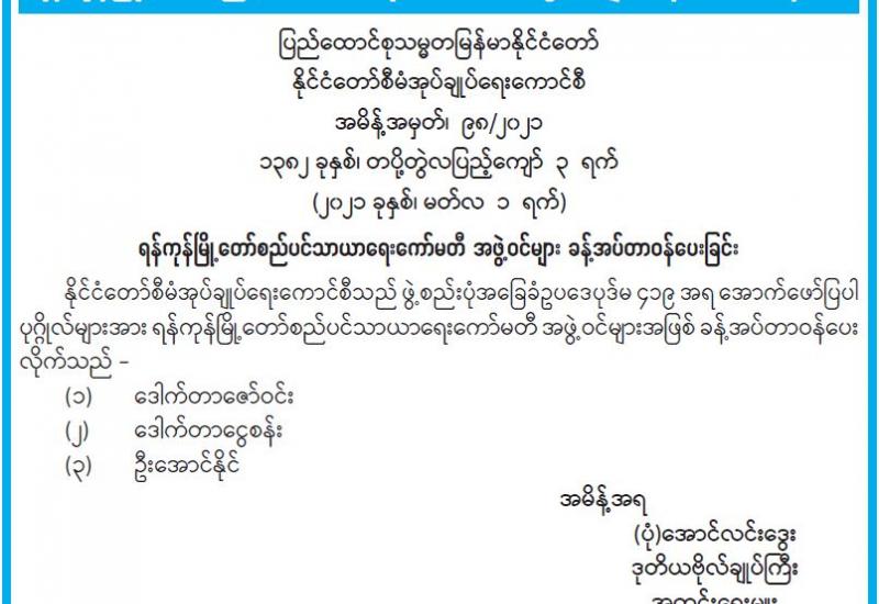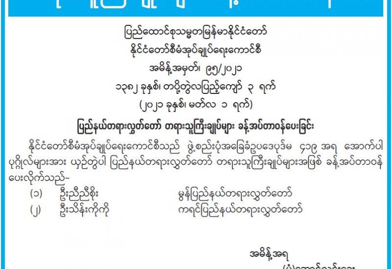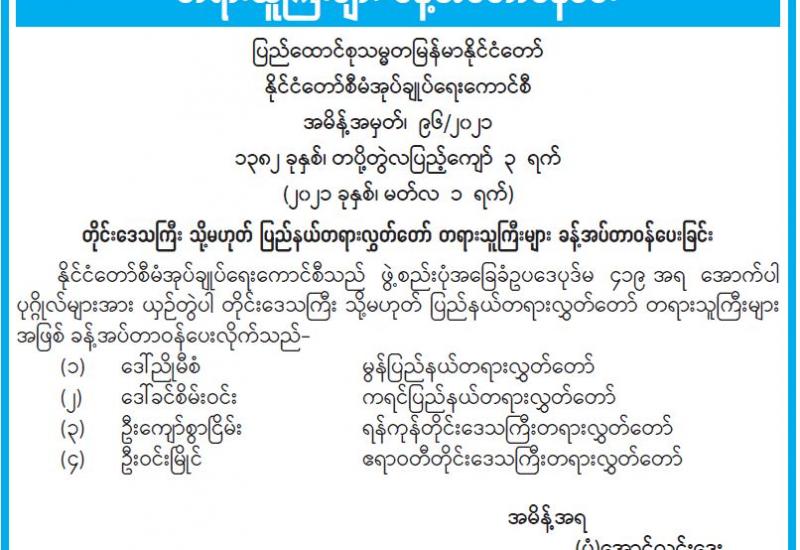 ပြည်ထောင်စုသမ္မတမြန်မာနိုင်ငံတော်၊ နိုင်ငံတော်စီမံအုပ်ချုပ်ရေးကောင်စီက ကြီးမှူးကျင်းပမည့် ၂၀၂၁ ခုနှစ်၊ သာသနာတော်ဆိုင်ရာဘွဲ့တံဆိပ်တော်များ ဆက်ကပ်လှူဒါန်းပွဲအခမ်းအနား ကျင်းပရေး ဦးစီးကော်မတီနှင့် လုပ်ငန်းကော်မတီ ညှိနှိုင်းအစည်းအဝေးကို ယနေ့နံနက် ၁၀ နာရီတွင် နေပြည်တော်ရှိ သာသနာရေးနှင့်ယဉ်ကျေးမှုဝန်ကြီးဌာန အစည်းအဝေးခန်းမ၌ ကျင်းပသည်။