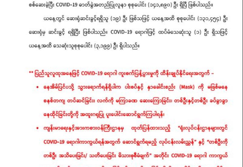 (၂၇-၂-၂၀၂၁)ရက်နေ့၊ ည (၈:၀၀)နာရီမှ (၂၈-၂-၂၀၂၁)ရက်နေ့၊ ည (၈:၀၀)နာရီအတွင်း ဓာတ်ခွဲ နမူနာစုစုပေါင်း (၁,၁၀၅) ခုအား စစ်ဆေးပြီးစီးခဲ့ရာ COVID-19 ရောဂါဓာတ်ခွဲအတည်ပြု လူနာသစ် (၆) ဦး တွေ့ရှိရပါသည်။ သို့ဖြစ်ပါ၍ ယနေ့အထိ ဓာတ်ခွဲနမူနာ စုစုပေါင်း (၂,၄၉၀,၉၈၉) ခုအား စစ်ဆေးခဲ့ပြီး COVID-19 ဓာတ်ခွဲအတည်ပြုလူနာ စုစုပေါင်း (၁၄၁,၈၉၆) ဦး ရှိပြီ ဖြစ်ပါသည်။