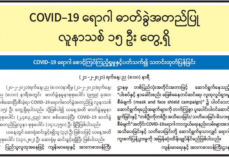 COVID-19 ရောဂါ ဓာတ်ခွဲအတည်ပြု လူနာသစ် ၁၅ ဦး တွေ့ရှိ