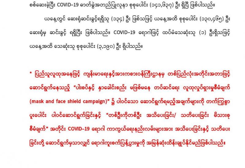 (၁၄-၂-၂၀၂၁)ရက်နေ့၊ ည (၈:၀၀)နာရီမှ (၁၅-၂-၂၀၂၁)ရက်နေ့၊ ည(၈:၀၀)နာရီအတွင်း ဓာတ်ခွဲ နမူနာစုစုပေါင်း (၈၈၇) ခုအား စစ်ဆေးပြီးစီးခဲ့ရာ COVID-19 ရောဂါ ဓာတ်ခွဲအတည်ပြု လူနာသစ် (၃၆) ဦး တွေ့ရှိရပါသည်။ သို့ဖြစ်ပါ၍ ယနေ့အထိ ဓာတ်ခွဲနမူနာ စုစုပေါင်း (၂,၄၇၆,၇၉၇) အား စစ်ဆေးခဲ့ပြီး COVID-19 ဓာတ်ခွဲအတည်ပြုလူနာ စုစုပေါင်း (၁၄၁,၆၃၇) ဦး ရှိပြီ ဖြစ်ပါသည်။