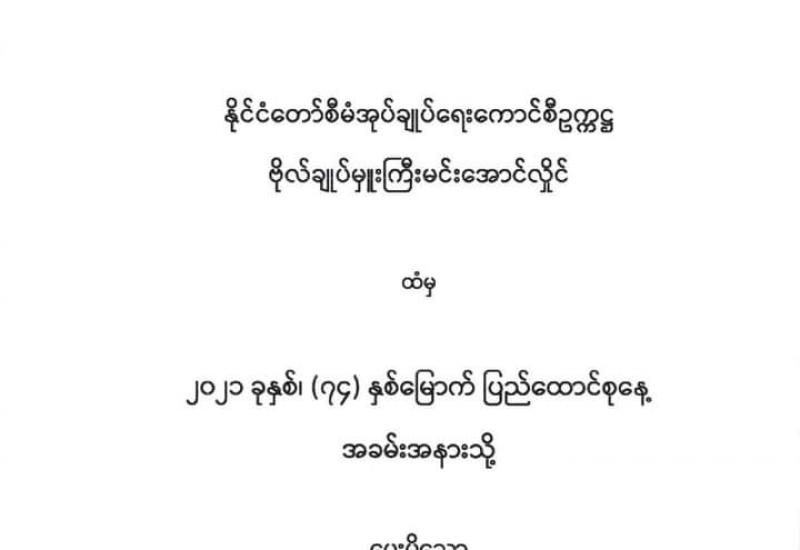 နိုင်ငံတော်စီမံအုပ်ချုပ်ရေးကောင်စီ၏ လမ်းညွှန်ချက်နှင့်အညီ စီးပွားရေးလုပ်ငန်းများ လုပ်ကိုင်ရာတွင် လွယ်ကူ လျင်မြန် ချောမွေ့စေရေး ညှိနှိုင်းအစည်းအဝေးကို ယနေ့နံနက်ပိုင်း တွင် ရင်းနှီးမြှုပ်နှံမှုနှင့်နိုင်ငံခြားစီးပွား ဆက်သွယ်ရေး ဝန်ကြီးဌာနမှ သက်ဆိုင်ရာဝန်ကြီးဌာန များနှင့် ကျင်းပသည်။