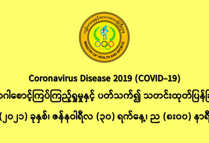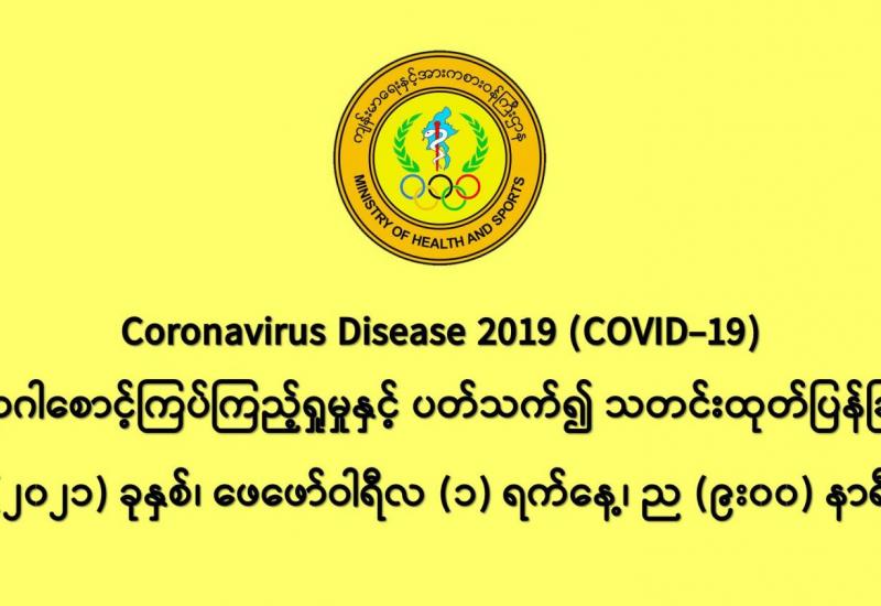 (၃၁-၁-၂၀၂၁)ရက်နေ့၊ ည (၈:၀၀)နာရီမှ (၁-၂-၂၀၂၁)ရက်နေ့၊ ည (၈:၀၀)နာရီအတွင်း ဓာတ်ခွဲ နမူနာ စုစုပေါင်း (၉,၀၁၉)ခု အား စစ်ဆေးပြီးစီးခဲ့ရာ COVID-19 ရောဂါ ဓာတ်ခွဲအတည်ပြုလူနာသစ် (၂၀၉) ဦး တွေ့ရှိရပါသည်။