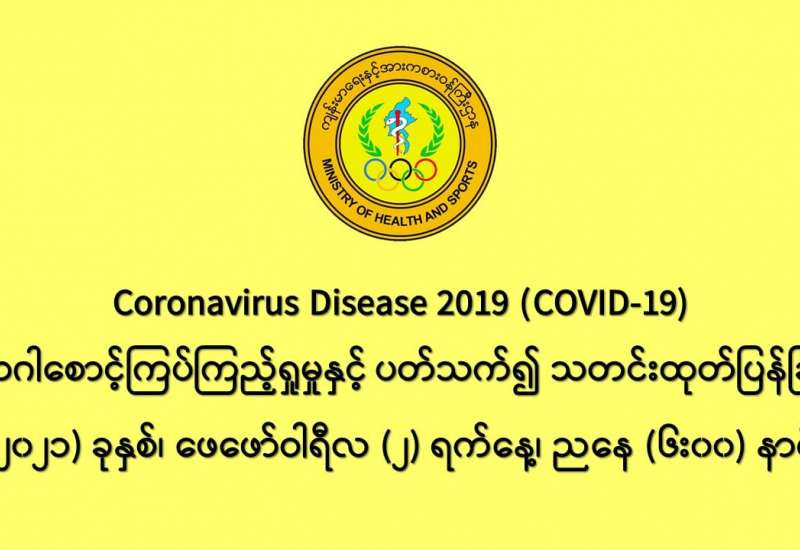 (၁-၂-၂၀၂၁)ရက်နေ့၊ ည (၈:၀၀)နာရီမှ (၂-၂-၂၀၂၁)ရက်နေ့၊ ည (၈:၀၀)နာရီအတွင်း ဓာတ်ခွဲ နမူနာ စုစုပေါင်း (၁၂,၃၇၇)ခု အား စစ်ဆေးပြီးစီးခဲ့ရာ COVID-19 ရောဂါ ဓာတ်ခွဲအတည်ပြုလူနာသစ် (၃၁၀) ဦး တွေ့ရှိရပါသည်။