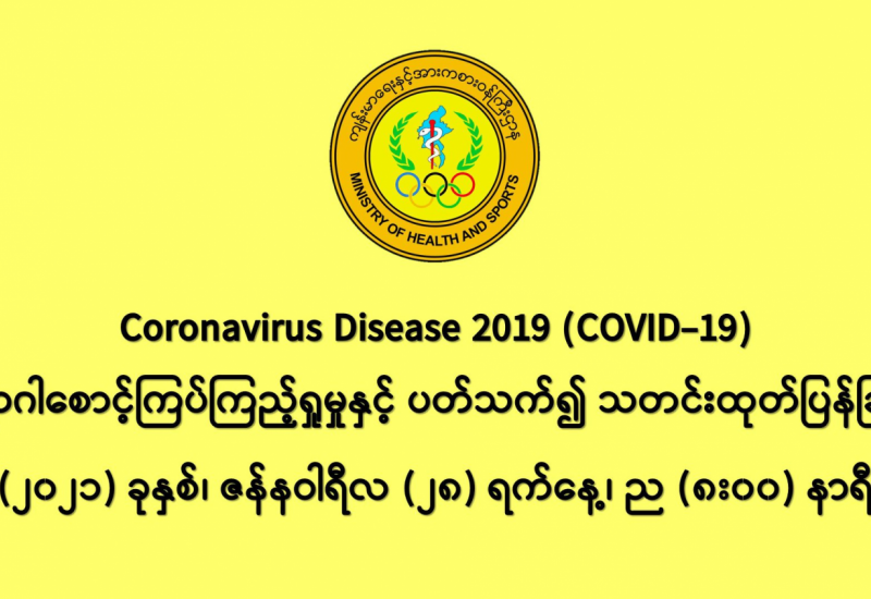(၂၇-၁-၂၀၂၁)ရက်နေ့၊ ည (၈:၀၀)နာရီမှ (၂၈-၁-၂၀၂၁)ရက်နေ့၊ ည (၈:၀၀)နာရီအတွင်း ဓာတ်ခွဲ နမူနာ စုစုပေါင်း (၁၆,၃၇၈)ခုအားစစ်ဆေးပြီးစီးခဲ့ရာ COVID-19 ရောဂါ ဓာတ်ခွဲအတည်ပြု လူနာသစ် (၃၅၀) ဦး တွေ့ရှိရပါသည်။