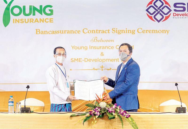 Young Insurance Co.,Ltd နှင့် SME-Development Bank တို့၏ ဘဏ်နှင့် အာမခံလုပ်ငန်း ပူးပေါင်းဆောင်ရွက်မှုဖြစ်သော Bancassurance စတင်ဆောင်ရွက်ခြင်း လက်မှတ်ရေးထိုးပွဲ အခမ်းအနားကို အောက်တိုဘာ ၂၀ ရက် နံနက် ၁၀ နာရီက ရန်ကုန်မြို့ ချက်ထရီယံဟိုတယ်၌ ကျင်းပရာ Young Insurance Company မှ အကြီးတန်း အထွေထွေမန်နေဂျာ ဦးအောင်စိုးဦးနှင့် SME Development Bank CEO ဒေါက်တာဇေယျာညွန့် တို့က နှစ်ဖက်သဘောတူစာချုပ်ကို လက်မှတ်ရေးထိုးလဲလှယ်လိုက်ကြကြောင်း သိရသည်။