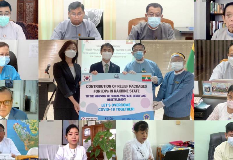 Korea International Cooperation Agency (KOICA) မှ ရခိုင်ပြည်နယ် စစ်တွေ၊ မြောက်ဦးနှင့် ကျောက်ဖြူခရိုင်များရှိ နေရပ်စွန့်ခွာသူများ အတွက် လူသုံးကုန်ပစ္စည်းများ လှူဒါန်းပွဲအခမ်းအနားကို ယနေ့နံနက်ပိုင်းတွင် ဗီဒီယိုကွန်ဖရင့် စနစ်ဖြင့် ကျင်းပသည်။