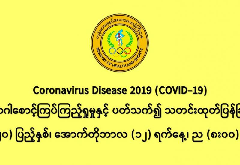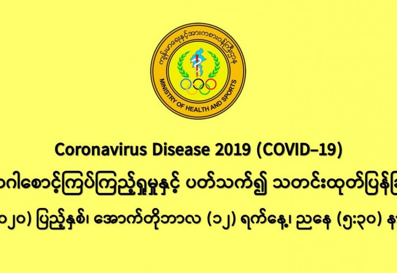(၁၁-၁၀-၂၀၂၀) ရက်နေ့၊ ည (၈:၀၀)နာရီမှ (၁၂-၁၀-၂၀၂၀) ရက်နေ့၊ ည (၈:၀၀) နာရီ အတွင်း ဓာတ်ခွဲနမူနာ စုစုပေါင်း (၁၄,၇၀၇)ခုအား စစ်ဆေးပြီးစီးခဲ့ရာ COVID-19 ရောဂါ ဓာတ်ခွဲအတည်ပြု လူနာသစ် (၁,၃၄၄)ဦး တွေ့ရှိရပါသည်။