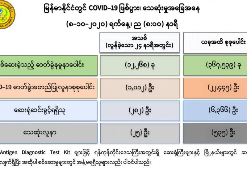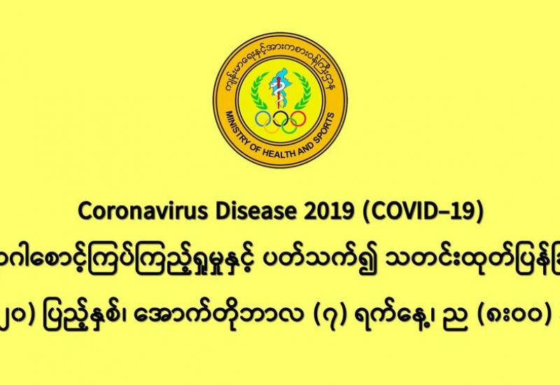 (၇-၁၀-၂၀၂၀) ရက်နေ့၊ ည (၈:၀၀)နာရီမှ (၈-၁၀-၂၀၂၀) ရက်နေ့၊ ည (၈:၀၀) နာရီ အတွင်းဓာတ်ခွဲနမူနာ စုစုပေါင်း (၁၂,၂၆၈)ခုအား စစ်ဆေးပြီးစီးခဲ့ရာ COVID-19 ရောဂါ ဓာတ်ခွဲ အတည်ပြု လူနာသစ် (၁,၀၁၂)ဦး တွေ့ရှိရပါသည်။