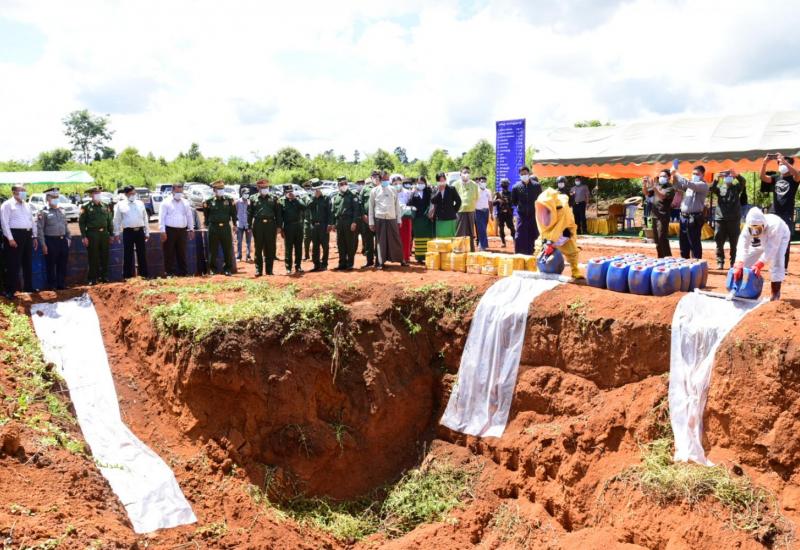ရှမ်းပြည်နယ်(တောင်ပိုင်း)၊ လွိုင်လင်ခရိုင်၊ ခိုလမ်နယ်မြေရဲစခန်းမှ ဖမ်းဆီးရမိသော မူးယစ်ဆေးဝါးချက်လုပ်ရာတွင် အသုံးပြုမည့် အက်စစ်ပုံးများ ဖျက်ဆီးခြင်းကို ယနေ့ နံနက်(၁၁) နာရီက ခိုလမ်-ကျိုင်းတောင်းကားလမ်းမဘေးတွင် ကျင်းပသည်။