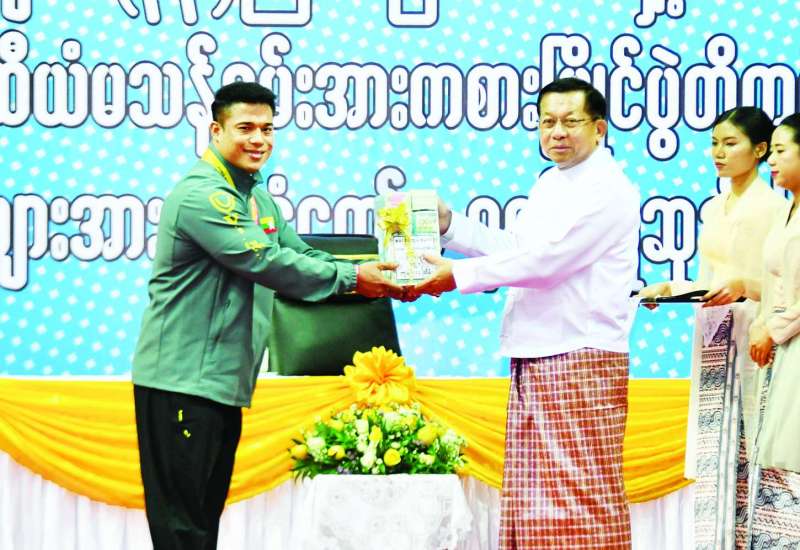 (၈)ကြိမ်မြောက် ကမ္ဘာ့ဗိုဗီနမ်ချန်ပီယံရှစ်ပြိုင်ပွဲ၊ (၁၆)ကြိမ်မြောက် ကမ္ဘာ့ကာယဗလနှင့် ကာယကြံ့ခိုင်မှုအားကစားပြိုင်ပွဲ၊ (၃၃)ကြိမ်မြောက် အရှေ့တောင် အာရှအားကစားပြိုင်ပွဲနှင့် (၁၃)ကြိမ်မြောက် အာဆီယံမသန်စွမ်းအားကစားပြိုင်ပွဲ တို့တွင် မြန်မာအားကစားအဖွဲ့များအနေဖြင့် ရွှေတံဆိပ် ၂၆ ခု၊ ငွေတံဆိပ် ၄၇ ခု၊ ကြေးတံဆိပ် ၇၇ ခု စုစုပေါင်း ဆုတံဆိပ် ၁၅၀ ရရှိခဲ့သည့် နိုင်ငံ့ဂုဏ်ဆောင်အားကစားသမားများနှင့် ပြိုင်ပွဲများတွင် ဆုတံဆိပ်များရရှိအောင် စွမ်းဆောင်ပေးခဲ့သည့် အုပ်ချုပ်/နည်းပြအဖွဲ့ ၂၈ ဖွဲ့အတွက် နိုင်ငံတော်က စုစုပေါင်းသိန်းပေါင်း ငွေကျပ် ၃၆၆၉၀ ဂုဏ်ပြုချီးမြှင့်ခဲ့သည်။
