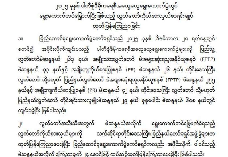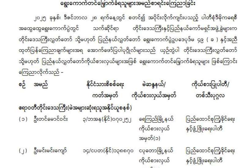 တိုင်းဒေသကြီးလွှတ်တော် သို့မဟုတ် ပြည်နယ်လွှတ်တော်ကိုယ်စားလှယ်အဖြစ် ရွေးကောက်တင်မြှောက်ခံရသူများ အမည်စာရင်းကြေညာခြင်း