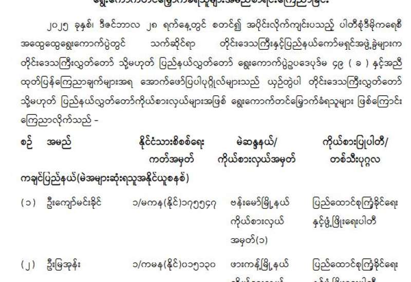 တိုင်းဒေသကြီးလွှတ်တော် သို့မဟုတ် ပြည်နယ်လွှတ်တော်ကိုယ်စားလှယ်အဖြစ် ရွေးကောက်တင်မြှောက်ခံရသူများ အမည်စာရင်းကြေညာခြင်း