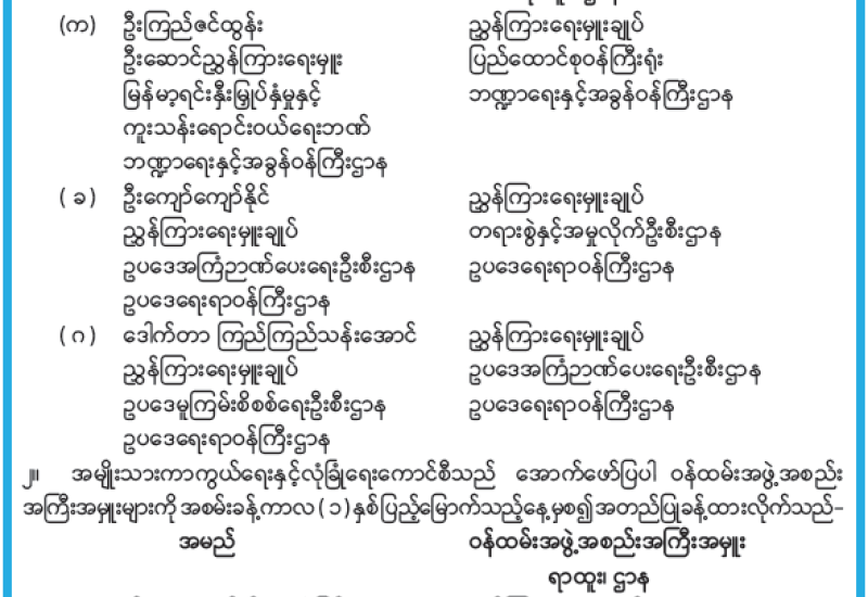 ဝန်ထမ်းအဖွဲ့အစည်းအကြီးအမှူးများ ပြောင်းရွှေ့ခန့်ထားခြင်းနှင့် ဝန်ထမ်းအဖွဲ့အစည်းအကြီးအမှူးများ အတည်ပြုခန့်ထားခြင်း