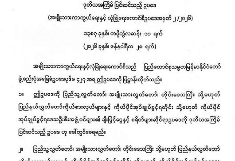ပြည်သူ့လွှတ်တော်၊ အမျိုးသားလွှတ်တော်၊ တိုင်းဒေသကြီး သို့မဟုတ် ပြည်နယ်လွှတ်တော်ကိုယ်စားလှယ်များနှင့် ကိုယ်ပိုင်အုပ်ချုပ်ခွင့်ရတိုင်း သို့မဟုတ် ကိုယ်ပိုင်အုပ်ချုပ်ခွင့်ရဒေသ ဦးစီးအဖွဲ့ဝင်များ၏ ချီးမြှင့်ငွေနှင့် စရိတ်များဆိုင်ရာ ဥပဒေကို ဒုတိယအကြိမ် ပြင်ဆင်သည့်ဥပဒေ