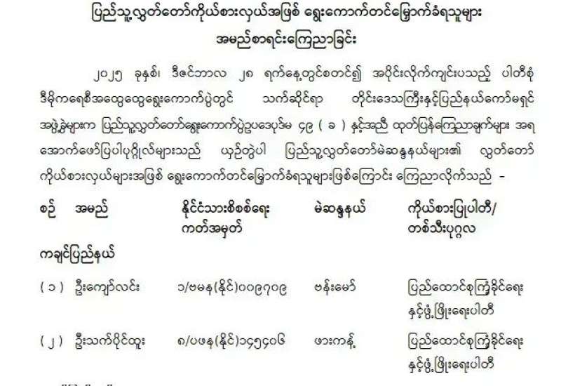 ပြည်သူ့လွှတ်တော်ကိုယ်စားလှယ်အဖြစ် ရွေးကောက်တင်မြှောက်ခံရသူများ အမည်စာရင်းကြေညာခြင်း