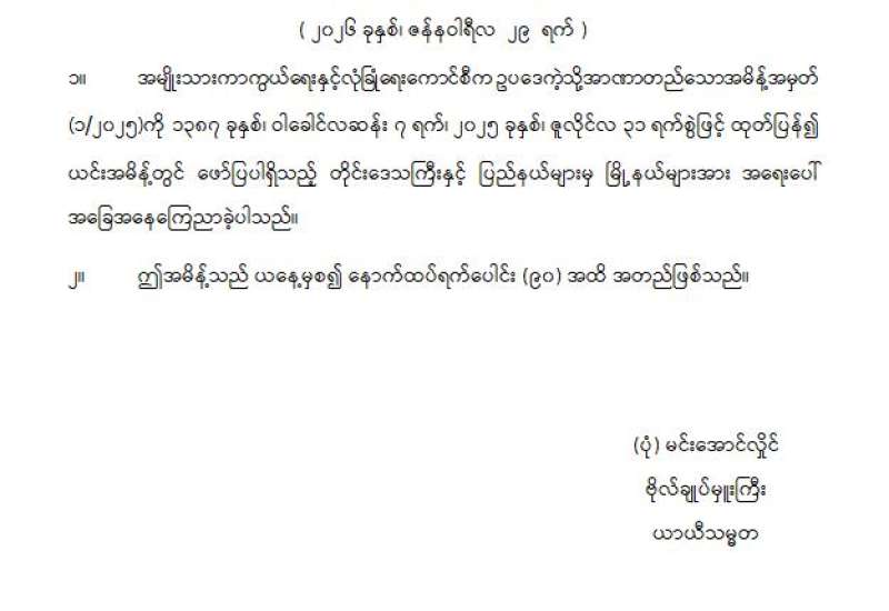 ပြည်ထောင်စုသမ္မတမြန်မာနိုင်ငံတော် အမျိုးသားကာကွယ်ရေးနှင့်လုံခြုံရေးကောင်စီ အရေးပေါ်အခြေအနေဆက်လက်ကြေညာခြင်း