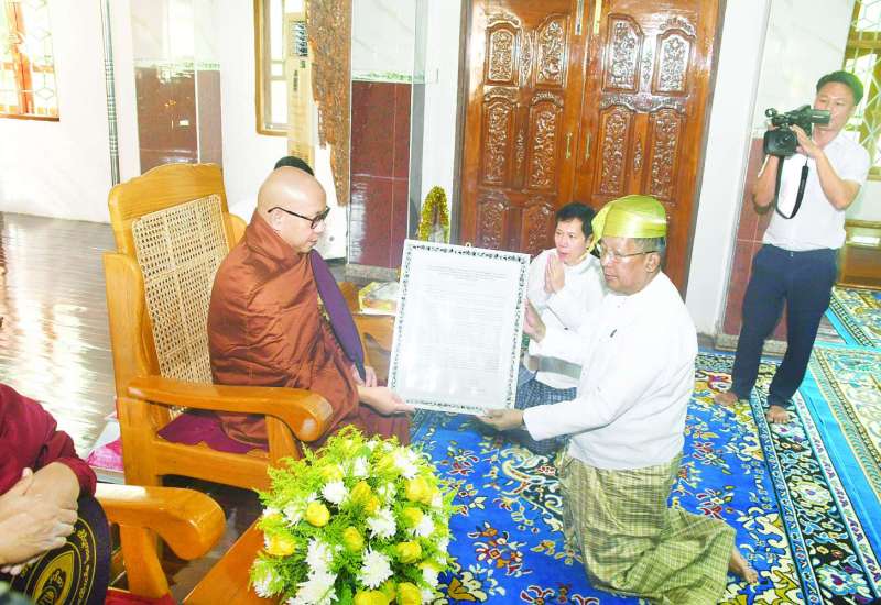 (၇၈) ကြိမ်မြောက် တိပိဋကဓရ တိပိဋကကောဝိဒ ရွေးချယ်ရေး စာမေးပွဲတွင် တိပိဋကဓရ တိပိဋကကောဝိဒ (၁၈)ပါးမြောက် ဘွဲ့တံဆိပ်တော်မြတ် ရရှိတော်မူသည့် ဘဒ္ဒန္တဝိစိတ္တသာရ ဆရာတော်ထံသို့ ပြည်ထောင်စုသမ္မတမြန်မာနိုင်ငံတော် ယာယီသမ္မတ နိုင်ငံတော်လုံခြုံရေးနှင့်အေးချမ်းသာယာရေးကော်မရှင်ဥက္ကဋ္ဌ ဗိုလ်ချုပ်မှူးကြီး သတိုးမဟာသရေစည်သူ သတိုးသီရိသုဓမ္မ မင်းအောင်လှိုင်ထံမှ ဆက်ကပ်ပေးပို့သည့် ဂုဏ်ယူဝမ်းမြောက်ကြောင်း သဝဏ်လွှာဆက်ကပ် လှူဒါန်းခြင်းအခမ်းအနားကို ယနေ့နံနက်ပိုင်းတွင် ရန်ကုန်တိုင်းဒေသကြီး ဒဂုံမြို့သစ်(အရှေ့ပိုင်း)မြို့နယ် တိပိဋကမဟာ ဂန္ထဝင်နိကာယ် ကျောင်းတိုက်၌ကျင်းပရာအခမ်းအနားသို့ သာသနာရေးနှင့်ယဉ်ကျေးမှုဝန်ကြီးဌာန ပြည်ထောင်စုဝန်ကြီး ဦးတင်ဦးလွင်၊ ရန်ကုန်တိုင်းဒေသကြီးဝန်ကြီးချုပ် ဦးစိုးသိန်း၊ တိုင်းဒေသကြီးအစိုးရအဖွဲ့ဝင်ဝန်ကြီးများ၊ သာသနာရေးဦးစီးဌာန ညွှန်ကြားရေးမှူးချုပ်နှင့် တာဝန်ရှိသူများ တက်ရောက်ကြည်ညိုကြသည်။