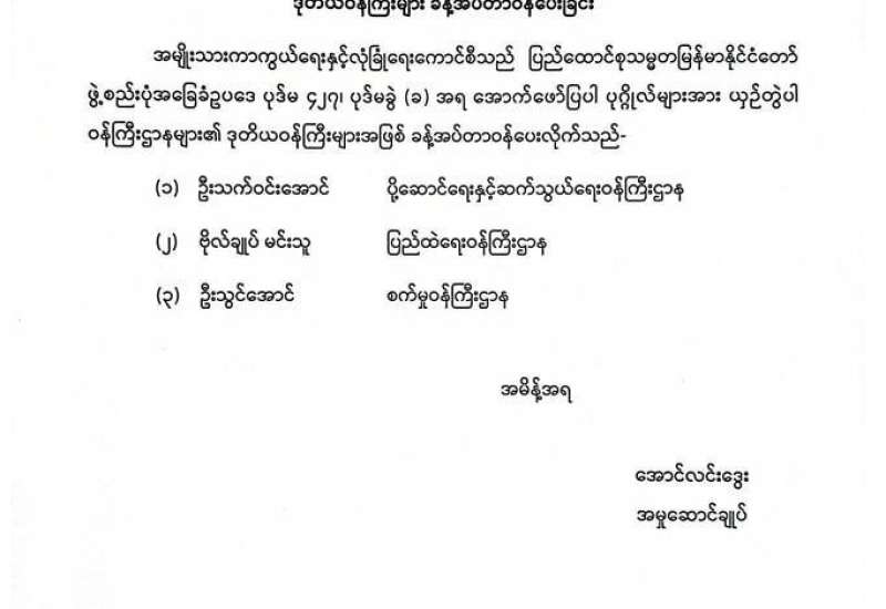 ဒုတိယဝန်ကြီးများ ခန့်အပ်တာဝန်ပေးခြင်း