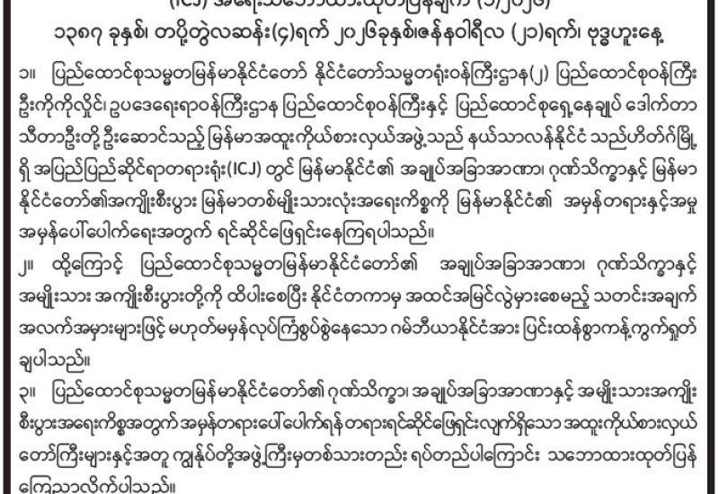 ပြည်ထောင်စုသမ္မတမြန်မာနိုင်ငံတော်၊ နိုင်ငံတော်သမ္မတရုံးဝန်ကြီးဌာန (၂) ပြည်ထောင်စုဝန်ကြီး ဦးကိုကိုလှိုင်၊ ဥပဒေရေးရာဝန်ကြီးဌာန ပြည်ထောင်စုဝန်ကြီးနှင့် ပြည်ထောင်စုရှေ့နေချုပ် ဒေါက်တာ သီတာဦးတို့ ဦးဆောင်သည့် မြန်မာကိုယ်စားလှယ်အဖွဲ့သည် ၂၀၂၆ ခုနှစ်၊ ဇန်နဝါရီလ (၁၂)ရက်နေ့မှ ဇန်နဝါရီလ (၂၉)ရက်နေ့အထိ နယ်သာလန်နိုင်ငံ၊ သည်ဟိတ်ဂ်မြို့ရှိ အပြည်ပြည်ဆိုင်ရာတရားရုံး International Court of Justice - (ICJ)သို့ သွားရောက်၍ ဂမ်ဘီယာနိုင်ငံ၏ စွပ်စွဲချက်များအား ဥပဒေနှင့်အညီ ဖြေရှင်းဆောင်ရွက်နေခြင်းသည် နိုင်ငံတစ်နိုင်ငံအနေဖြင့် တာဝန်ယူမှုရှိသော လုပ်ရပ် တစ်ခုဖြစ်ပြီး နိုင်ငံတကာဥပဒေစည်းမျဉ်းများကို လေးစားလိုက်နာလိုသည့်ဆန္ဒကိုလည်း ဖော်ပြနေ ခြင်းဖြစ်ပါသည်။