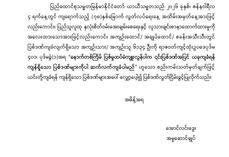 ပြည်ထောင်စုသမ္မတမြန်မာနိုင်ငံတော်၊ အမျိုးသားကာကွယ်ရေးနှင့်လုံခြုံရေးကောင်စီသည် ယနေ့တွင်ကျရောက်သည့် (၇၈) နှစ်မြောက် လွတ်လပ်ရေးနေ့အထိမ်းအမှတ်နေ့ကို ဂုဏ်ပြုသောအားဖြင့် ပြည်သူလူထုနှလုံးစိတ်ဝမ်းအေးချမ်းစေရန်နှင့် လူမှုရေးအရ ငဲ့ညှာထောက်ထားပြီး နိုင်ငံတော်၏ မေတ္တာနှင့် စေတနာကိုနားလည်စေရန်ရှေးရှု၍ ၂ဝ၂၆ ခုနှစ်၊ ဇန်နဝါရီလ ၄ ရက်နေ့မတိုင်မီ လူသတ်မှု၊ မုဒိမ်းမှု၊ ပေါက်ကွဲစေတတ်သော ဝတ္တုပစ္စည်းများအက်ဥပဒေအရ ပြစ်မှုများ၊ မတရားအသင်းများအက်ဥပဒေအရ ပြစ်မှုများ၊ ၁၈၇၈ ခုနှစ် လက်နက်များ အက်ဥပဒေပုဒ်မ ၁၉(စ)အရ ပြစ်မှုများ၊ ၁၉၄၉ ခုနှစ် လက်နက် (အရေးပေါ် ပြစ်ဒဏ်စီရင်မှု) (ယာယီ) အက်ဥပဒေအရ ပြစ်မှုများ၊ ၁၉၅၁ ခုနှစ် လက်နက် (ယာယီပြင်ဆင်ချက်) အက်ဥပဒေအရ ပြစ်မှုများ၊ ၁၉၂၄ ခုနှစ် ရှမ်းပြည်နယ်လက်နက်အမိန့်အရ ပြစ်မှုများ၊ ၂ဝ၂၃ ခုနှစ်၊ လက်နက်ဥပဒေအရ ပြစ်မှုများ၊ မူးယစ်ဆေးဝါးနှင့် စိတ်ကိုပြောင်းလဲစေတတ်သော ဆေးဝါးများဆိုင်ရာ ဥပဒေအရပြစ်မှုများ၊ သဘာဝဘေးအန္တရာယ်ဆိုင်ရာစီမံခန့်ခွဲမှုဥပဒေအရ ပြစ်မှုများ၊ အကြမ်းဖက်မှုတိုက်ဖျက်ရေး ဥပဒေအရပြစ်မှုများနှင့် အဂတိလိုက်စားမှု တိုက်ဖျက်ရေးဥပဒေအရ ပြစ်မှုများမှအပ တည်ဆဲဥပဒေတစ်ရပ်ရပ်အရ ပြစ်မှုတစ်ခုခုနှင့်စပ်လျဉ်း၍ ပြစ်ဒဏ်ချမှတ်ခြင်းခံရပြီး အကျဉ်းထောင်/ အချုပ်ထောင်/ စခန်းအသီးသီးတွင် ပြစ်ဒဏ်ကျခံလျက်ရှိသော အကျဉ်းသား/အကျဉ်းသူများကို ရာဇဝတ်ကျင့်ထုံးဥပဒေပုဒ်မ ၄၀၁၊ ပုဒ်မခွဲ(၁) အရ ယင်းတို့ကျခံရန် ကျန်ရှိသောပြစ်ဒဏ်၏ ခြောက်ပုံတစ်ပုံကို လွတ်ငြိမ်းသက်သာခွင့်အားလည်းကောင်း၊ နိုင်ငံတစ်ဝန်းရှိ အကျဉ်းထောင်/ အချုပ်ထောင်/စခန်းအသီးသီးတွင် ပြစ်ဒဏ်ကျခံလျက်ရှိသော အကျဉ်းသား/ အကျဉ်းသူ ၆၁၃၄ ဦးကို ရာဇဝတ်ကျင့်ထုံးဥပဒေပုဒ်မ ၄၀၁၊ ပုဒ်မခွဲ(၁)အရ “နောက်တစ်ကြိမ် ပြစ်မှုထပ်မံကျူးလွန်ပါက ၎င်းပြစ်ဒဏ်အပြင် ယခုကျခံရန် ကျန်ရှိသော ပြစ်ဒဏ်များကိုပါ ဆက်လက်ကျခံပါမည်" ဟူသော စည်းကမ်းသတ်မှတ်ချက်ဖြင့် ယင်းတို့ကျခံရန်ကျန်ရှိသော ပြစ်ဒဏ်များအပေါ် လျှော့ပေါ့၍ ပြစ်ဒဏ်လွတ်ငြိမ်းခွင့်ပြုလိုက်ကြောင်း သိရှိရသည်။