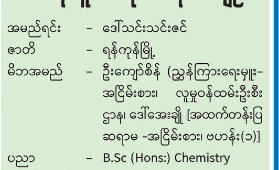 ကျွန်မ ရန်ကုန်တက္ကသိုလ်တွင် ဂုဏ်ထူးတန်းတက်ရောက်ခွင့်ရရှိကြောင်း သိလိုက်ရချိန်မှာ ပျော်လိုက်သည်ဖြစ်ခြင်း၊ အမှန်တော့ ဟိုးငယ်စဉ် ကလေးဘဝကတည်းက ဘွဲ့နှင်းသဘင် ခန်းမကြီးမှာ ဘွဲ့တက်ရောက်ယူကြသော အစ်ကို၊ အစ်မဝမ်းကွဲများ၏ ဓာတ်ပုံများကို ငေးမောကြည့်ရှုရင်း တစ်နေ့နေ့ တစ်ချိန်ချိန်မှာ မိမိကိုယ်တိုင်