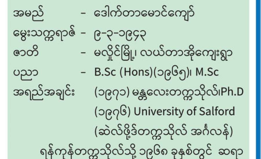 နယ်မြို့တစ်မြို့တွင် မွေးဖွားကြီးပြင်းသူ ကျွန်တော့်အနေဖြင့် ရန်ကုန်တက္ကသိုလ်တွင် တက်ရောက်ခွင့်ရမည်ဟု ထင်မှတ်မထားပါ။ အထက်တန်းကျောင်းသားဘဝ ရန်ကုန်သို့ရောက်စဉ် တက္ကသိုလ်ကျောင်းသား အစ်ကိုဝမ်းကွဲက ခေါ်သွားသဖြင့် တက္ကသိုလ် ပရိဝုဏ်သို့ ခြေချဖူးသည်။ အထင်ကြီးလေးစားစိတ်နှင့်အတူ တက္ကသိုလ်ကျောင်းသားဘဝ အားကျပြီး ၁၀ တန်း အောင်ရန် ခွန်အား၊ တွန်းအား ဖြစ်ပါသည်။