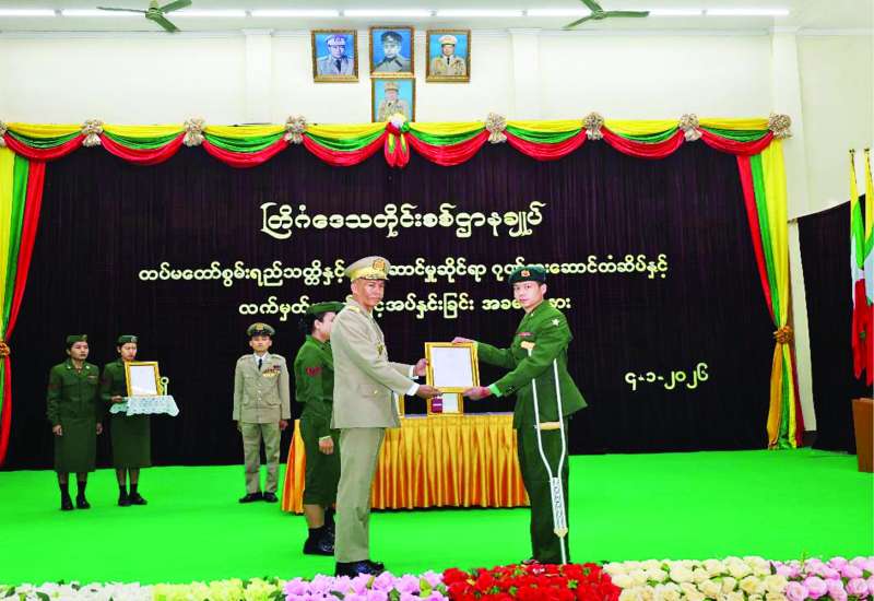 တပ်မတော်စွမ်းရည်သတ္တိဆိုင်ရာ ဂုဏ်ထူးဆောင်ဘွဲ့တံဆိပ်နှင့် လက်မှတ်များပေးအပ်ချီးမြှင့်ခြင်းအခမ်းအနားများကို ယနေ့မွန်းလွဲပိုင်းတွင် တိုင်းစစ်ဌာနချုပ် အသီးသီး၌ကျင်းပပြုလုပ်ကြရာ သက်ဆိုင်ရာတိုင်းစစ်ဌာနချုပ်များမှ တိုင်းမှူးများ၊ တပ်မတော်အရာရှိကြီးများ၊ အရာရှိ၊ စစ်သည်၊ မိသားစုများ၊ ဂုဏ်ထူးဆောင် ဘွဲ့တံဆိပ်ချီးမြှင့်ခြင်းခံရသူများနှင့် မိဘဆွေမျိုးများ၊ ဖိတ်ကြားထားသူများ တက်ရောက်ကြသည်။