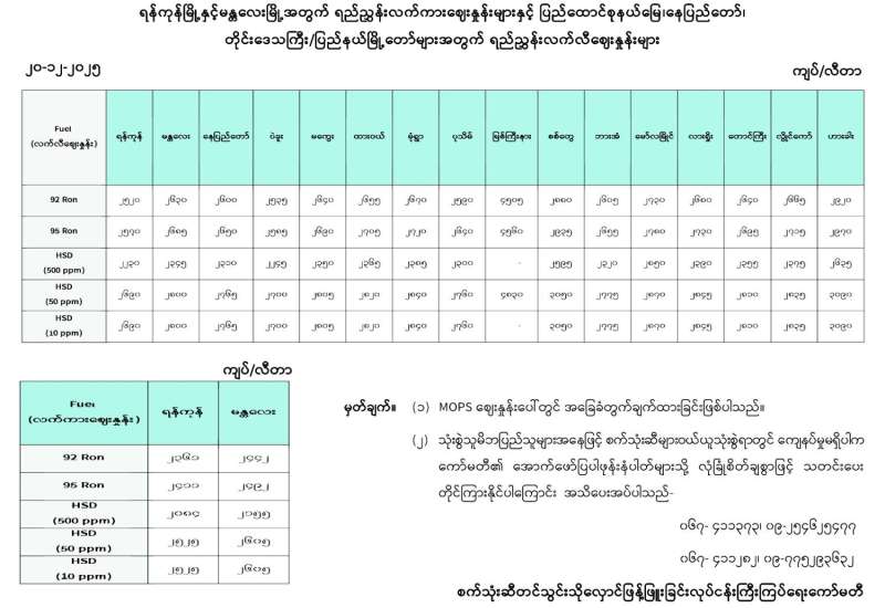 ရန်ကုန်မြို့နှင့် မန္တလေးမြို့အတွက် ရည်ညွှန်းလက်ကားဈေးနှုန်းများနှင့် ပြည်ထောင်စုနယ်မြေ နေပြည်တော်၊ တိုင်းဒေသကြီး/ပြည်နယ် မြို့တော်များအတွက် ရည်ညွှန်းလက်လီဈေးနှုန်းများ