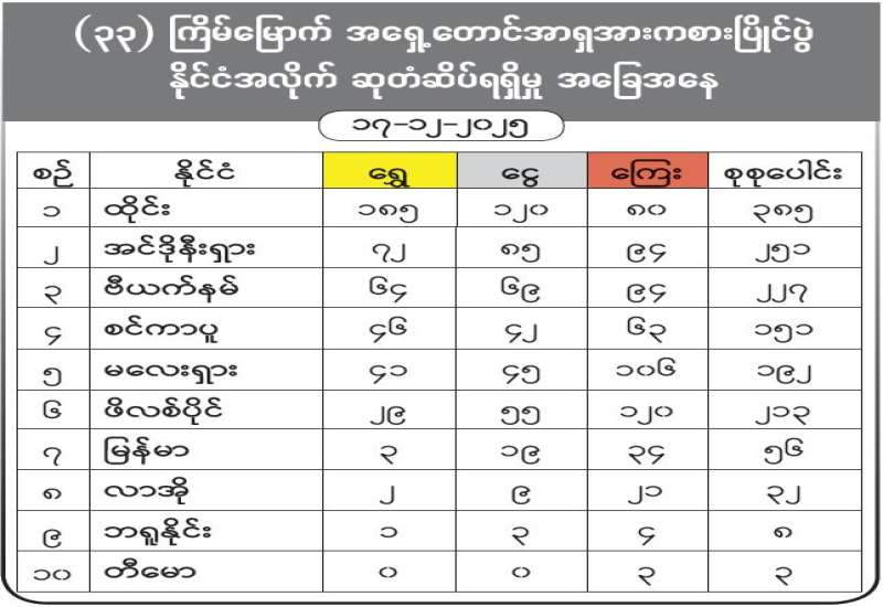(၃၃)ကြိမ်မြောက် အရှေ့တောင်အာရှအားကစားပြိုင်ပွဲကို ထိုင်းနိုင်ငံ ဘန်ကောက်နှင့် ချွန်ဘူရီမြို့များရှိ သက်ဆိုင်ရာအားကစား ကွင်း၊ အားကစားရုံများ၌ ကျင်းပပြုလုပ်လျက်ရှိပြီး မြန်မာအသင်းအနေဖြင့် ပိုက်ကျော်ခြင်း၊ စကွက်ရ်၊ စက်ဘီး၊ သေနတ်ပစ်၊ စားပွဲတင်တင်းနစ်၊ ကဘာဒီ၊ ခရစ်ကတ်၊ လက်ဝှေ့၊ ဘိလိယက်နှင့် စနူကာ၊ ဖူဆယ်၊ E-sports၊ အပြည်ပြည်ဆိုင်ရာလှေ၊ မြင်းစီး၊ နပန်းနှင့် ရွက်လှေပြိုင်ပွဲများ၌ ဝင်ရောက်ယှဉ်ပြိုင်ခဲ့ရာ ယနေ့နံနက်ပိုင်းတွင် မြန်မာနိုင်ငံ အိုလံပစ်ကော်မတီ အထွေထွေအတွင်းရေးမှူး၊ အားကစားနှင့်လူငယ်ရေးရာဝန်ကြီးဌာန ဒုတိယဝန်ကြီး ဦးထိန်လင်း၊ ပို့ဆောင်ရေးနှင့်ဆက်သွယ်ရေးဝန်ကြီးဌာနဒုတိယဝန်ကြီး ဦးအောင်ကျော်ထွန်း၊ ထိုင်းနိုင်ငံဆိုင်ရာ ပြည်ထောင်စုသမ္မတ မြန်မာနိုင်ငံသံအမတ်ကြီး ဦးဇော်ဇော်စိုးနှင့်၊ စစ်သံမှူးကြီး ဗိုလ်မှူးချုပ်ဝင်းသူလင်းနှင့် ဇနီး၊ မြန်မာအားကစားအဖွဲ့ ခေါင်းဆောင်၊ အားကစားနှင့် ကာယပညာဦးစီးဌာန ညွှန်ကြား ရေးမှူးချုပ်နှင့် အုပ်ချုပ်မှုအဖွဲ့ဝင်များ၊ မြန်မာအားကစားအဖွဲ့ချုပ် ဥက္ကဋ္ဌများနှင့် တာဝန်ရှိသူများ တက်ရောက်ကြည့်ရှုအားပေးကြသည်။