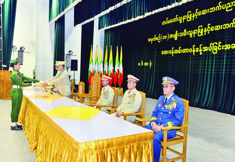 ပြည်သူများအား နှိပ်စက်ညှဉ်းပန်း၍ ဒေသဖွံ့ဖြိုးတိုးတက်မှုကို ချွတ်ခြုံကျစေသည့် အကြမ်းဖက်လုပ်ရပ်များကို လုပ်ဆောင်ခဲ့သော ကျောက်မဲမြို့ ဒေသတစ်ဝိုက်ရှိ လက်နက်ကိုင်အကြမ်းဖက်အဖွဲ့များနှင့် PDF အမည်ခံအကြမ်းဖက်အဖွဲ့များအား ရွပ်ရွပ်ချွံချွံတိုက်ပွဲဝင်၍ အဆိုပါမြို့နှင့် ဒေသတစ်ဝိုက်အား ဒေသခံပြည်သူများ၏ လက်ဝယ်သို့ ပြန်လည်အပ်နှင်းနိုင်ခဲ့သည့် အောင်ပွဲအလီလီရ ရှေ့တန်းပြန်နိုင်ငံ့ သားကောင်းတပ်မတော်သားများအား ဂုဏ်ပြုကြိုဆိုခြင်းကို ယနေ့နံနက်ပိုင်းတွင် ရှမ်းပြည်နယ် (မြောက်ပိုင်း) သီပေါမြို့နယ် နမ့်လန်ကျေးရွာအုပ်စုရှိ နယ်မြေခံတပ်ရင်း၌ ကျင်းပပြုလုပ်ရာ အရှေ့မြောက်တိုင်းစစ်ဌာနချုပ် တိုင်းမှူး ဗိုလ်မှူးချုပ် အေးမင်းဦးနှင့် တာဝန်ရှိသူများ၊ ဌာနဆိုင်ရာတာဝန်ရှိသူများ၊ တပ်မတော်သားများ၊ မိသားစုဝင်များ၊ ဆရာ ဆရာမများ၊ ကျောင်းသား ကျောင်းသူများနှင့် ဒေသခံတိုင်းရင်းသားပြည်သူများက ဝမ်းမြောက်စွာ သောင်းသောင်းဖြဖြ ကြိုဆိုဂုဏ်ပြုကြသည်။