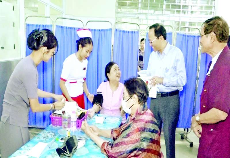 ကျန်းမာရေးဝန်ကြီးဌာန ပြည်ထောင်စုဝန်ကြီး ပါမောက္ခ ဒေါက်တာ သက်ခိုင်ဝင်းသည် ကျန်းမာရေးလူ့စွမ်းအားအရင်းအမြစ်ဦးစီးဌာန ညွှန်ကြားရေးမှူးချုပ် ဒေါက်တာတင်ထွန်းနှင့်အတူ ယနေ့နံနက်ပိုင်းတွင် ရန်ကုန်ပြည်သူ့ဆေးရုံကြီးသို့ သွားရောက်၍ နှစ်စဉ်ပြုလုပ်သော သက်ကြီးဆရာဝန်ကြီးများ ကျန်းမာရေးစစ်ဆေးကုသမှု ဆောင်ရွက်ခြင်းကို ကြည့်ရှုအားပေးသည်။
