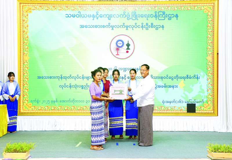 သမဝါယမနှင့်ကျေးလက်ဖွံ့ဖြိုး ရေးဝန်ကြီးဌာန၊ အသေးစားစက်မှု လက်မှုလုပ်ငန်းဦးစီးဌာနက အကောင်အထည်ဖော် ဆောင်ရွက်လျက်ရှိသည့် “အသေးစားကုန်ထုတ်လုပ်ငန်းများ ဖန်တီးပေးနိုင်ရေးနှင့် ကျေးလက်နေမိသားစုဝင်ငွေတိုးရေးစီမံကိန်း” ၏ ၂၀၂၅-၂၀၂၆ ဘဏ္ဍာနှစ် နေပြည်တော် ကောင်စီနယ်မြေအတွင်း ဖွင့်လှစ်ခဲ့သည့် စက်ချုပ်သင်တန်း၊ မော်တော်ဆိုင်ကယ်ပြုပြင် ထိန်းသိမ်းနည်းပညာသင်တန်း၊ စားသောက်ကုန်နှင့် လူသုံးကုန်ထုတ်လုပ်မှုသင်တန်းများ၏ လုပ်ငန်းသုံးပစ္စည်းများပေးအပ်ပွဲနှင့် သင်တန်းဆင်းလက်မှတ်ပေးအပ်ပွဲကို ယနေ့နံနက်ပိုင်းက အဆိုပါဝန်ကြီးဌာနစုပေါင်းအစည်းအဝေးခန်းမ၌ ကျင်းပသည်။