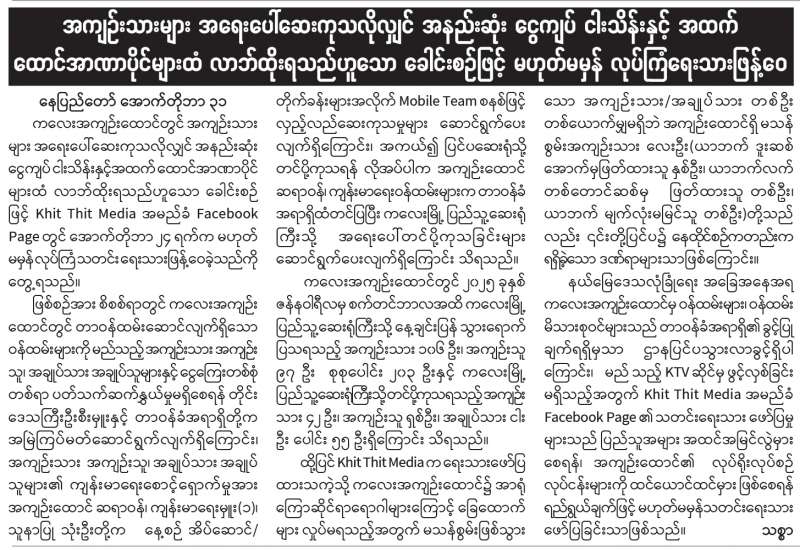 အကျဉ်းသားများအရေးပေါ်ဆေးကုသလိုလျှင် အနည်းဆုံးငွေကျပ် ငါးသိန်းနှင့်အထက် ထောင်အာဏာပိုင်များထံ လာဘ်ထိုးရသည်ဟူသော ခေါင်းစဉ်ဖြင့် မဟုတ်မမှန်လုပ်ကြံရေးသားဖြန့်ဝေ