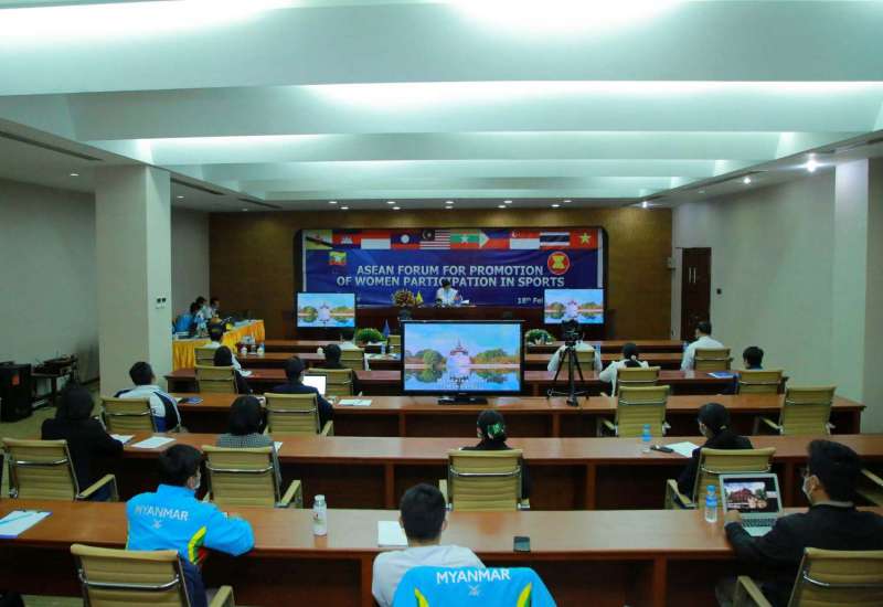 အာဆီယံအားကစားဆိုင်ရာ အမျိုးသမီးများ ပူးပေါင်းပါဝင်မှု မြှင့်တင်ရေးဖိုရမ် “ASEAN Forum for Promotion of Women Participation in Sports” ကို ယနေ့နံနက်ပိုင်းတွင် နေပြည်တော်ရှိ ဝဏ္ဏသိဒ္ဓိဘောလုံးအားကစားကွင်း၌ Virtual Online စနစ်ဖြင့် ကျင်းပသည်။