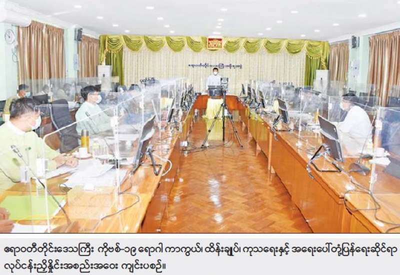 ဧရာဝတီတိုင်းဒေသကြီး ရခိုင်ပြည်နယ်နှင့် ချင်းပြည်နယ်အတွင်း ဆောင်ရွက်လျက်ရှိသည့် ကိုဗစ်-၁၉ ရောဂါ ကာကွယ်၊ ထိန်းချုပ်၊ ကုသရေးနှင့် အရေးပေါ်တုံ့ပြန်ရေးဆိုင်ရာ လုပ်ငန်းညှိနှိုင်း အစည်းအဝေးများကို ယနေ့တွင် သက်ဆိုင်ရာ တိုင်းဒေသကြီးနှင့် ပြည်နယ်အသီးသီးရှိ အစည်းအဝေးခန်းမများ၌ ပြုလုပ်ကြရာ တိုင်းဒေသကြီးနှင့် ပြည်နယ်များမှ ဝန်ကြီးချုပ်များ၊ တိုင်းစစ်ဌာနချုပ်အသီးသီးမှ တိုင်းမှူးများနှင့် တာဝန်ရှိသူများ၊ ဌာနဆိုင်ရာ တာဝန်ရှိသူများ တက်ရောက်ကြသည်။