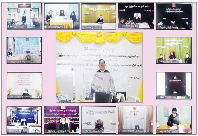 ပြည်ထောင်စုတရားလွှတ်တော်ချုပ်နှင့် တိုင်းဒေသကြီး/ ပြည်နယ်တရားလွှတ်တော်များ၊ ကိုယ်ပိုင် အုပ်ချုပ်ခွင့် ရတိုင်းတရားရုံး၊ ကိုယ်ပိုင် အုပ်ချုပ်ခွင့်ရဒေသတရားရုံးများ၊ ခရိုင်တရား ရုံးများ၏ (၂) ကြိမ်မြောက် လုပ်ငန်းညှိနှိုင်း အစည်းအဝေးကို ယနေ့နံနက် ၉ နာရီတွင် နေပြည်တော် ရှိ ပြည်ထောင်စုတရားလွှတ်တော်ချုပ်၌ ဗီဒီယိုကွန်ဖရင့် စနစ်ဖြင့် ကျင်းပရာ ပြည်ထောင်စုတရားသူကြီးချုပ် ဦးထွန်းထွန်းဦး တက်ရောက်၍ အမှာစကား ပြောကြားသည်။