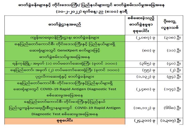 ကျန်းမာရေးဝန်ကြီးဌာနအနေဖြင့် နိုင်ငံအတွင်း ကူးစက်ဖြစ်ပွားနေသော COVID-19 ရောဂါ ကာကွယ်၊ ကုသ၊ ထိန်းချုပ်ရေးလုပ်ငန်းများကို အရှိန်အဟုန်မြှင့် ဆောင်ရွက်လျက်ရှိပါသည်။