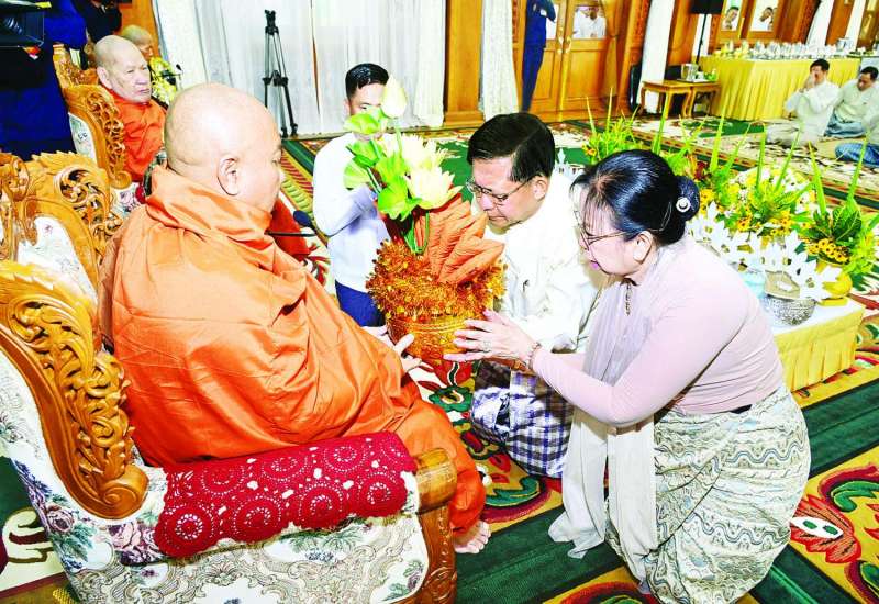ကာကွယ်ရေးဦးစီးချုပ်ရုံး(ကြည်း၊ ရေ၊ လေ)မိသားစုများ၏ ၂၀၂၅ ခုနှစ်မဟာ ဘုံကထိန်အလှူတော်မင်္ဂလာအခမ်းအနားကို ယနေ့နံနက်ပိုင်းတွင် ကာကွယ်ရေးဦးစီးချုပ်ရုံး(ကြည်း) အနော်ရထာခန်းမ၌ ဆင်ယင်ကျင်းပပြုလုပ်ရာ နိုင်ငံတော်လုံခြုံရေးနှင့်အေးချမ်းသာယာရေးကော်မရှင်ဥက္ကဋ္ဌ တပ်မတော်ကာကွယ်ရေးဦးစီးချုပ် ဗိုလ်ချုပ်မှူးကြီး မင်းအောင်လှိုင်နှင့် ဇနီး ဒေါ်ကြူကြူလှတို့တက်ရောက်၍ ကထိန်လျာသင်္ကန်းနှင့် လှူဖွယ်ပစ္စည်းများ ဆက်ကပ်လှူဒါန်းသည်။