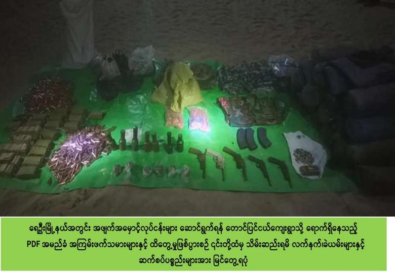 ပြည်သူလူထု အထိတ်အလန့်ဖြစ်စေရန်အတွက် ဖောက်ခွဲဖျက်ဆီးခြင်းနှင့် အပြစ်မဲ့ ပြည်သူများအား လုပ်ကြံသတ်ဖြတ်ခြင်းစသည့် အကြမ်းဖက်လုပ်ရပ်များအား ဆောင်ရွက် နိုင်မှုမရှိစေရေး ဖော်ထုတ်ဖမ်းဆီးခြင်းများအား နေ့/ညမပြတ် ဆောင်ရွက်လျက်ရှိရာ ၂၀၂၂ ခုနှစ်၊ ဇန်နဝါရီလ ၂၉ ရက်တွင် ဝမ်းတွင်းမြို့နယ်၊ တဲစုကျေးရွာအတွင်း လုံခြုံရေး တပ်ဖွဲ့ဝင်များမှ စစ်ဆေးခြင်းများ ဆောင်ရွက်လျက်ရှိစဉ် မသင်္ကာဖွယ် အမျိုးသား ၃ ဦးမှာ ဆိုင်ကယ် ၁ စီးဖြင့် ရောက်ရှိ လာသဖြင့် စစ်ဆေးရန် ရပ်တန့်ခိုင်းသော်လည်း ရပ်တန့်ခြင်းမရှိဘဲ လုံခြုံရေးတပ်ဖွဲ့ဝင်များအား ပြန်လည်ပစ်ခတ်ရန် ဆောင်ရွက်လာ သောကြောင့် လုံခြုံရေး တပ်ဖွဲ့ဝင်များမှ ပစ်ခတ်ဖမ်းဆီးခဲ့ရာ ခင်ဘန်းကျေးရွာနေ ညီညီ(၂၈)နှစ်အား အသံတိတ် ပြောင်းပါ GLOCK ပစ္စတို ၁ လက်၊ ၎င်းကျည် ၁၀ တောင့် နှင့်အတူ အခင်းဖြစ်ပွားသည့် နေရာတွင် အသေဖမ်းဆီးရမိခဲ့ပြီး သဲတောလေး ကျေးရွာနေ ကျော်သက်(၃၀) နှစ်နှင့် နှင်းမောင်(၃၆)နှစ်တို့ ၂ ဦးအား တူရကီနိုင်ငံထုတ် ပစ္စတို ၁ လက်၊ ၅ လုံးပြူး ၁ လက်၊ ပွိုင့် 38 ကျည် ၂၀ တောင့်၊ ၉မမ ကျည် ၆၆ တောင့် တို့နှင့်အတူ ဖမ်းဆီးရမိခဲ့သည်။